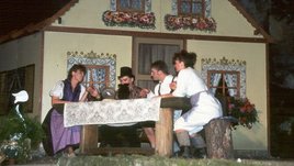 Mit dem Stück "Der Wahrsager von Schönberg" von Werner Ohnemus standen die Akteure der katholischen Theatergruppe bereits zum zehnten Jahr in Folge auf der Freilichtbühne. Das Stück handelte von zwei Familien, die sich gegenseitig vorschwindelten, mehr zu haben als die anderen. Als sich die Kinder der Streithähne auch noch verlieben und das Weite suchen muss der Knecht, als Wahrsager verkleidet, einiges aufbieten, um die Sache wieder in Ordnung zu bringen. Am Ende dürfen die Kinder heiraten und auch der Wahrsagerkommt unter die Haube.